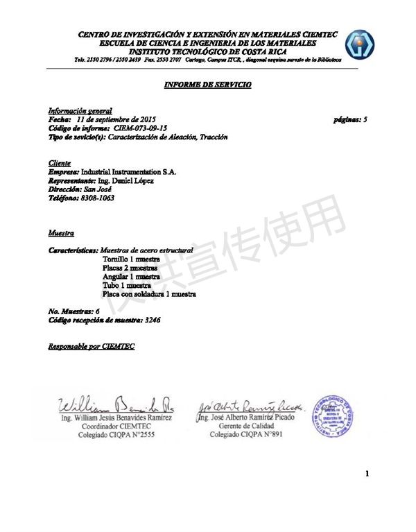 Certificado de calidad de material Costa Rica
