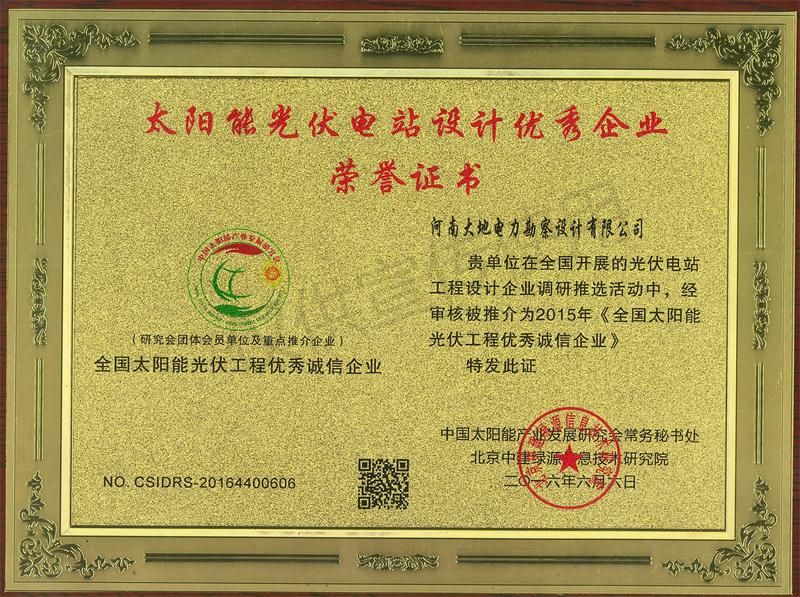 Certificado Honorario de Empresa Sobresaliente de Ingeniería fotovoltaica
