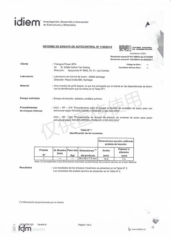 Certificado de NCH 203 Chile